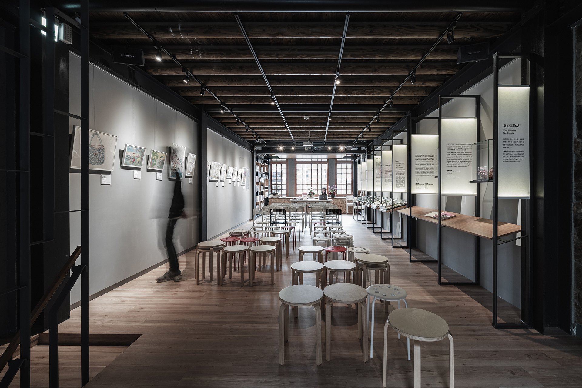 入口第一進為咖啡店,重新組成宛女阿嬤的畫作和描繪阿嬤細膩的筆觸,牆面上畫作的圖案會透過人的觸摸印出人的痕跡,牆面裡是阿嬤們療癒過程的創作,打開的過程是和作品的對話也是在探索老房子舊有的紋理。