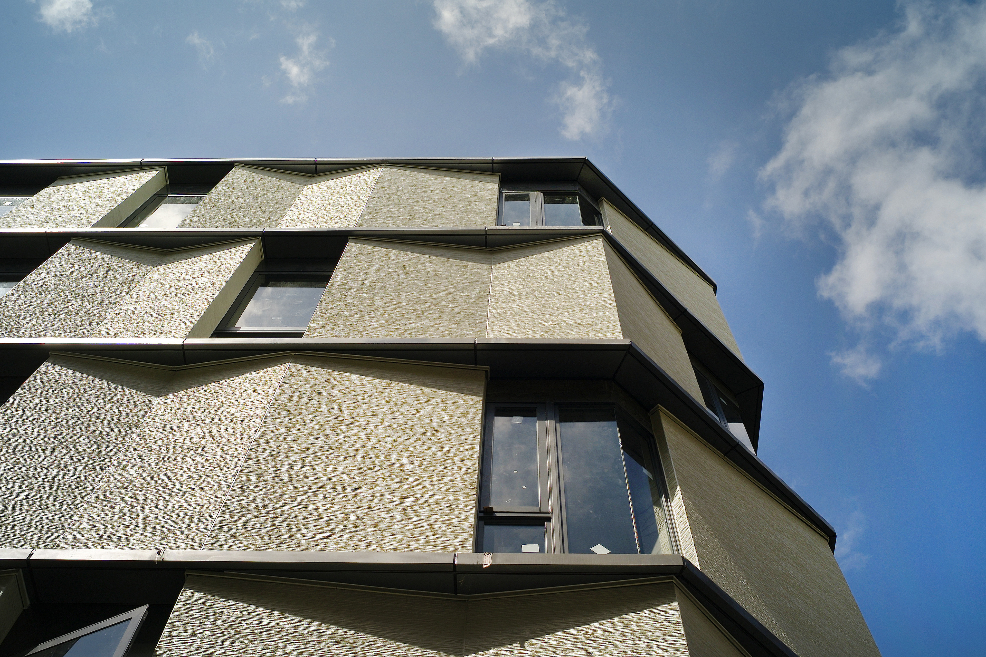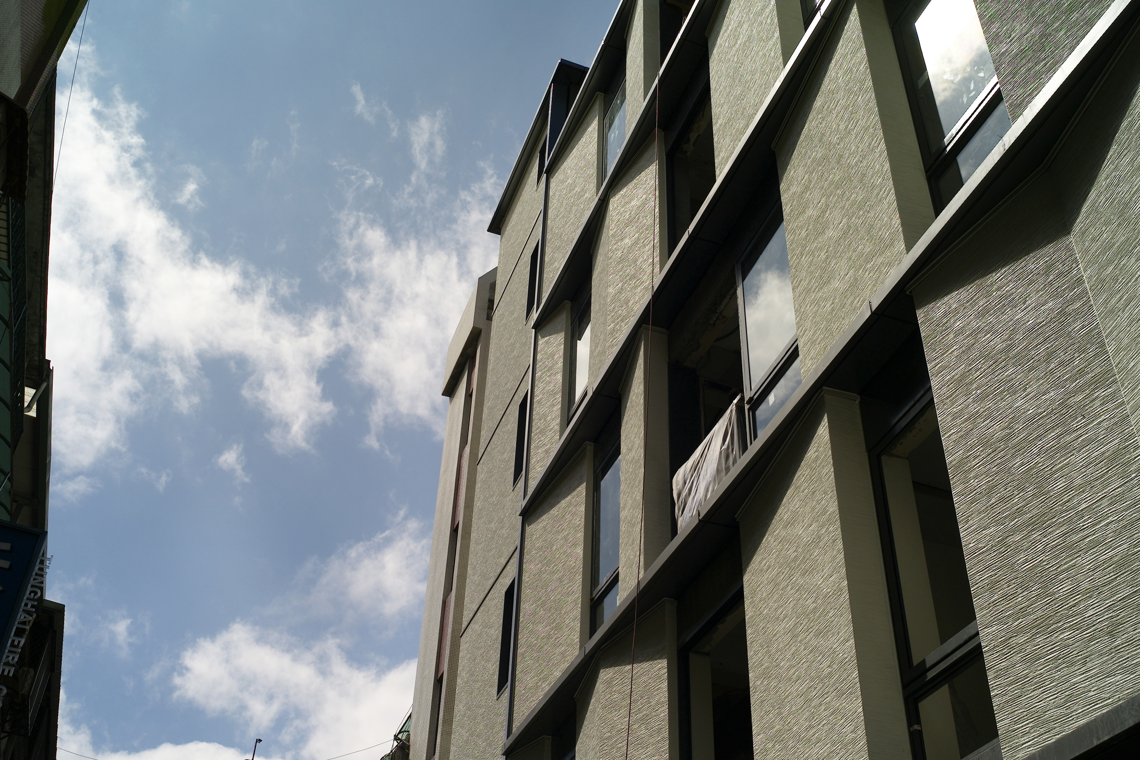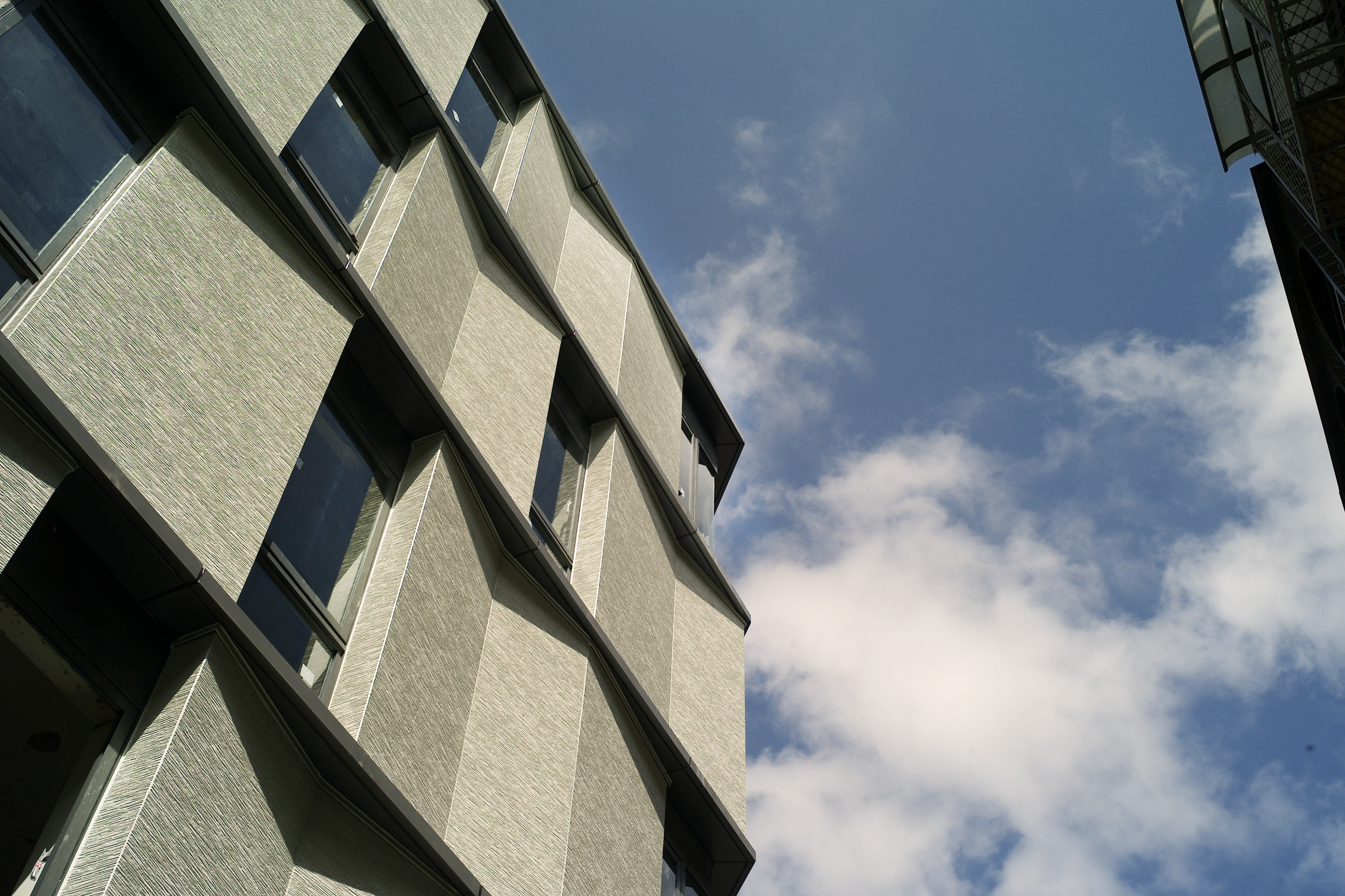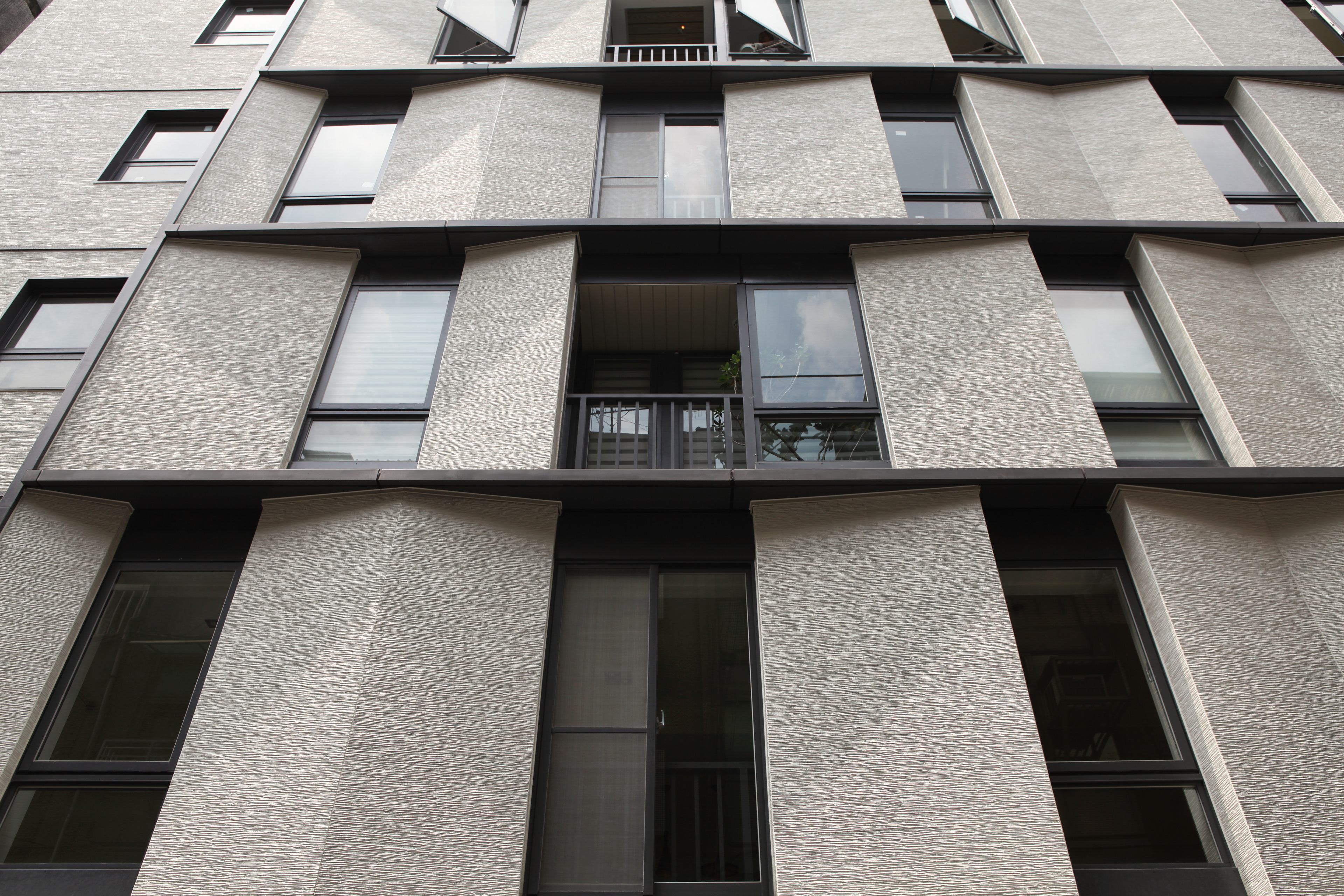 陶瓷纖維板做折板配置,使陽光能在立面上產生不同時段的光影變化,使兩側巷道來往行人能享有新的立面表情;新的立面性能像是替房子穿上可通風透氣的時尚雨衣,使水與熱能隔絕在外。